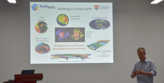 Müller教授首先簡(jiǎn)要介紹了悉尼大學(xué)EarthByte課題組基本情況,以及利用EarthByte課題組開(kāi)發(fā)的GPlates軟件構(gòu)建虛擬地球的方法,展示了其相關(guān)的研究成果。隨后,他詳細(xì)講解了威爾遜旋回中的洋中脊長(zhǎng)度、海底擴(kuò)張速度、俯沖洋殼年齡等參數(shù),影響海水中鈣與鎂的比重、洋底熱流分布的機(jī)制。