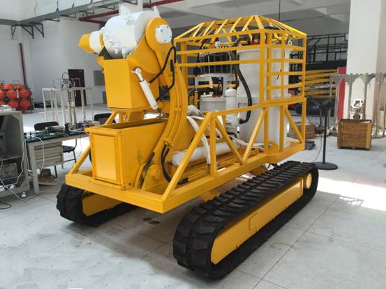 該采樣機由底盤、液壓系統、電子艙、破碎頭、收集裝置等組成,依靠遠程遙控,通過履帶行走方式,可適應海底崎嶇不平地形,利用破碎頭可輕松剝離破碎富鈷結殼,利用行走機構和四桿機構可收集并儲存礦樣。